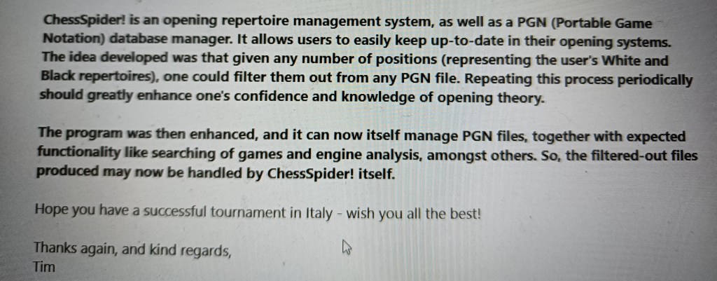 Candidate Master Timothy Mifsud from Malta very kindly (on 20 September this year) sent me a gift of his Chess Spider! 4.2 (the most up-to-date version that he has created, so far). You can read about it below, and you can order directly from Tim (at an excellent price) via chessbites@gmail.com. Feel free to also check out his site http://www.chessbites.com π.