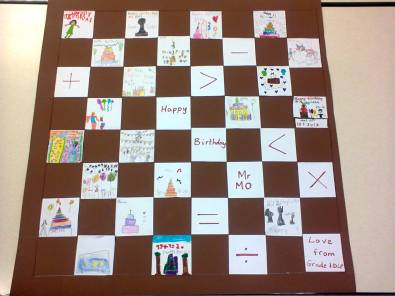 In addition to receiving lots of lovely cards, I was also surprised by a gigantic picture of a chess board, made by a class of 6-7-year-olds at school.