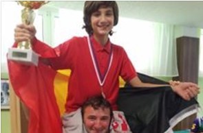 Daniel Dardha, European Under-12 Chess Champion, on the shoulders of proud dad, Arben Dardha