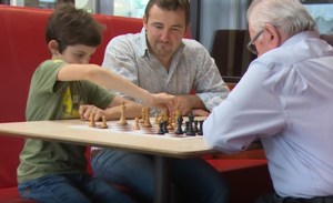 Daniel playing chess against his grandfather, while Arben (who is both a father and a son there!) watches with interest