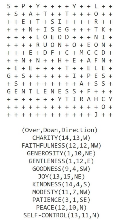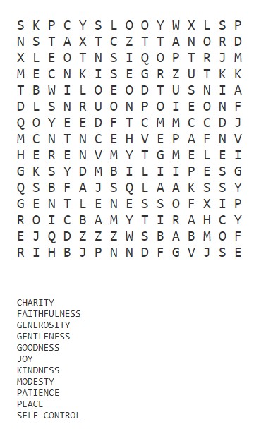 The wordsearch below includes the fun challenge of finding some of the good words and qualities which are often referred to as the ‘Fruits Of The Holy Spirit’.