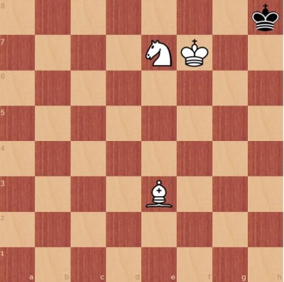 White checkmates in a mere 3 moves with 1 Ng6+ Kh7 2 Nf8+ Kh8 3 Bd4#.