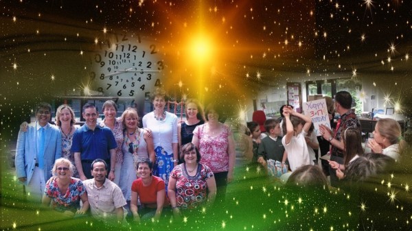 Assume that the dozen adults on the left of the picture (including me in the dark blue shirt) are all the same age. To calculate their total age at that time, add up all the forty-eight numbers on the clock shown, then subtract 12, and double what you get. After doing that, your further fun challenge is to figure out how much older I was in the photo on the right of the picture, where my students and their parents had arranged a lovely, surprise party for me turning 3 x 17 !!