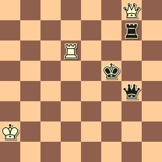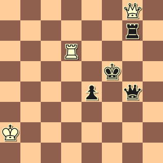With a black pawn on e4, White forces checkmate in at most four moves via 1 Qf8+ and then either 1…Ke5 2 Qf6# or 1…Kg5 2 Qf6+ Kh5 3 Qh6# or 1…Rf7 2 Qxf7+ Kg5 3 Qf6+ Kh5 4 Qh6# in the longest line.