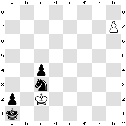 - White avoids promoting the h-pawn to a queen or bishop (which would result immediately in stalemate), and instead wins with 1 h8=R Nb1 2 Rh1! c3 3 Rh4! Na3+ (3…Nd2 is similar) 4 Kxc3 Nb1+ 5 Kc2 Na3+ 6 Kb3 Nb1 7 Rd4 (7 Rh2 is equally effective) 7…Na3 8 Rd2 and mate follows on White’s next move! ♥