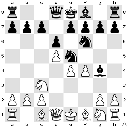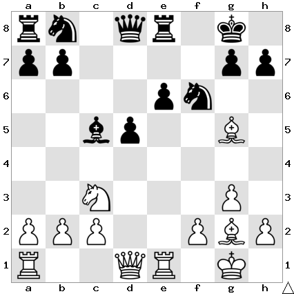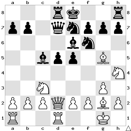 1 e4 g6 2 d4 Bg7 3 Nc3 d6 4 Be3 Nf6 5 Qd2 0-0 6 Nf3 a6 7 Bh6 Bg4 8 h4 c5 9 h5 Bxh5 10 Bd3 Bxf3 11 gxf3 cxd4 12 Bxg7 Kxg7 13 Qh6+ Kg8 14 e5 dxe5 15 Ne4 Re8 16 Ng5 Qa5+ 17 Ke2 e4 18 fxe4 e5 19 Nxh7 Nxh7