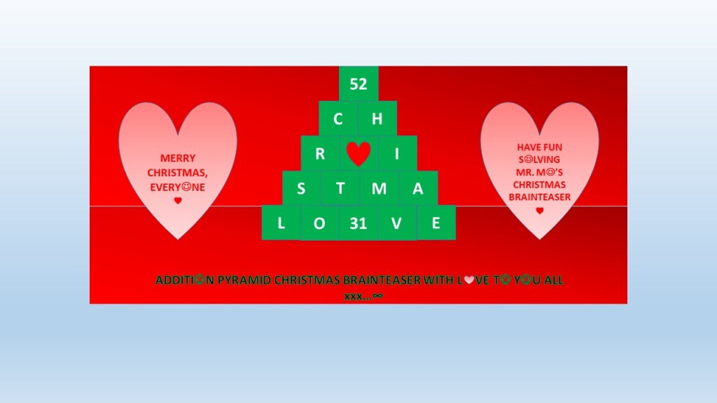 Christmas (no less than any other time) offers you, me, and the whole world a perfect opportunity to recognise clearly, and celebrate with joy and thanks, God’s perfect love for us in having sent ♥ Jesus as the one true Saviour ♥ that we all need if we are to go to Heaven after our short lives now. In comparison to that all-important truth, I realise that anything that I might know about Mathematics, Chess, or other subjects, is practically insignificant.