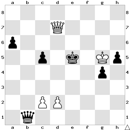 In the Chess study, White wins with 1 c4! (threatening 2 Qd5#) 1…Qe4 2 d4+!, after which either 2…cxd4 or 2…Qxd4 is met by 3 Qe7#.