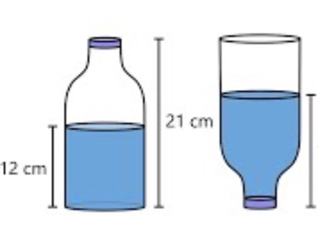 Imagine that the bottle could be swapped for a shorter wholly cylindrical bottle with the same capacity (and with the base radius unchanged). Its new full height would be 12 Γ· 65.57 x 100 = 18.30cm, correct to four significant figures. So, the part without liquid would be equivalent to a column of height 18.30-12 = 6.30cm. Therefore, the height indicated in the right-hand picture would be 21 – 6.30 = 14.70cm, or 147mm correct to the nearest millimetre. That’s nice here in Blog Post #147 😊