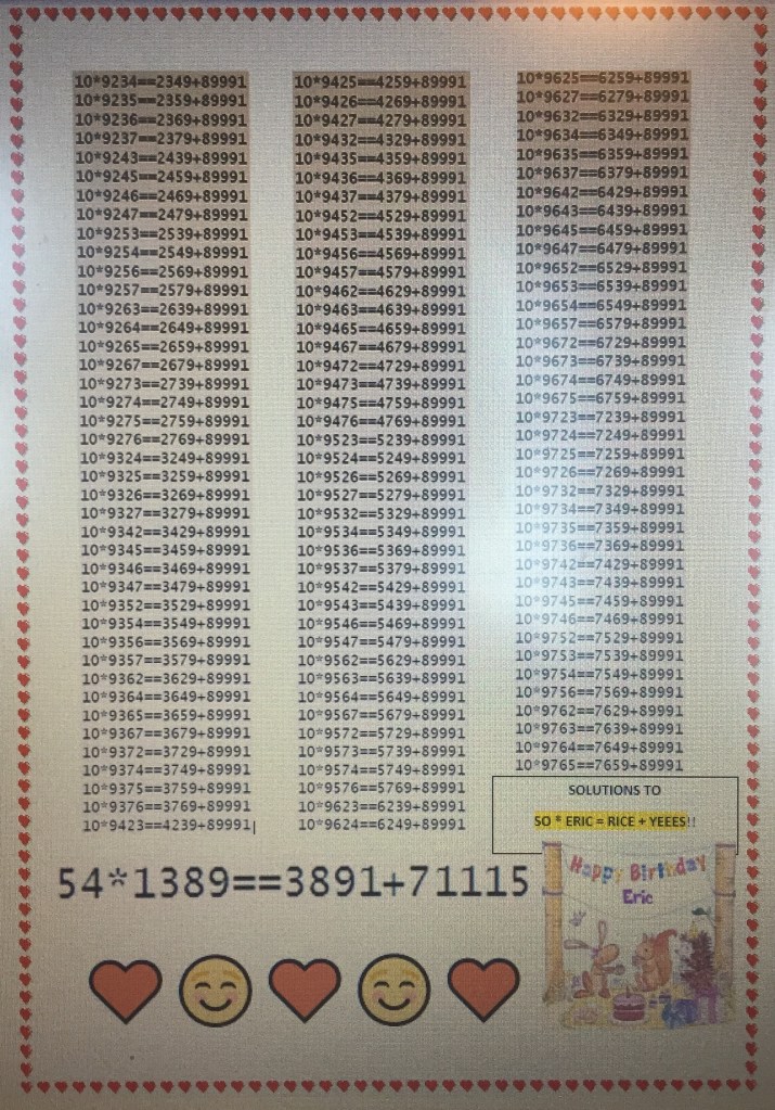 - 89 x (100 – 89) x 2 = 1958, Eric’s birth year. (Note that there were no other reasonable ‘solutions’, since 88 x (100 – 88) x 2 = 2112 & 90 x (100 – 90) x 2 = 1800.)